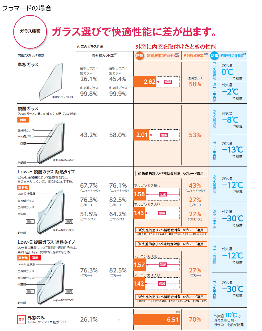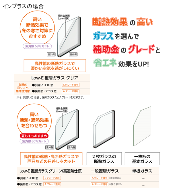断熱効果の高いガラスを選ぶことで補助金のグレードが上がり、快適さと補助額を向上することができます。