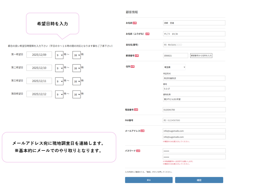 お客様の都合のいい日をいくつか候補を頂き、その候補日の中で施工担当者と日程調整します。